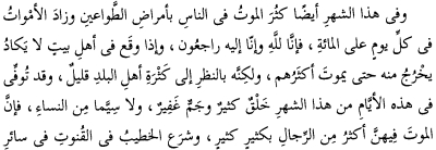 | 1348-06-00-Damascus | 31 May 1348 JL | Black Death in Damascus from May 31 to June 28, 1348) with every day more than 100 people died; especially women. | The Black Death in Damascus: In the month of Rabīʿ I 749 H (May 31 to June 28, 1348), every day more than 100 people died of plague (amrāḍ al-ṭawāʿīn) in Damascus; especially women died. | Ibn Kathīr - Al-Bidāya wa-l-nihāya 1997-1999, vol. 18 (1998), p. 503. | Translation by Undine Ott | |