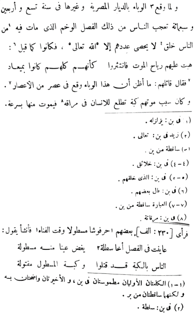 | 1348-04-00-Egypt | April 1348 JL | The Black Death in Egypt and other countries in 749 H (April 1, 1348 to March 22, 1349): People were taken by surprise by the epidemic (wabāʾ) whose death toll was high. The odors of death met them. People died quickly of the disease after buboes had appeared at their earlobes (marrāq). | al-Nuwayrī - Kitāb al-Ilmām 1968-1976, vol. 4 (1970), pp. 126-127; 143. | Translation needed | ||